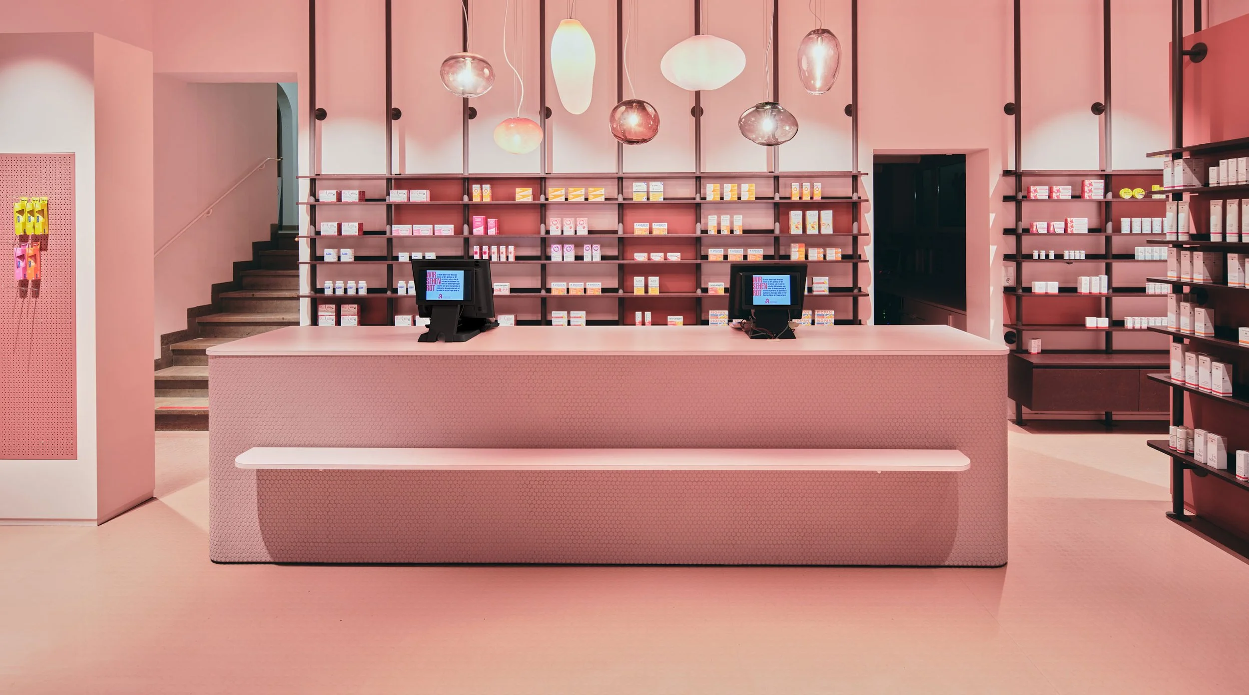 Vollständig in Rosé getaucht setzt die Münchener Apotheke am Englischen Garten ein bewusstes Zeichen. Sie transformiert diesen funktionalen Raum in einen Ort des Wohlbefindens. Der zarte Rosaton umhüllt Flächen, Möblierung und tänzelt im Licht.